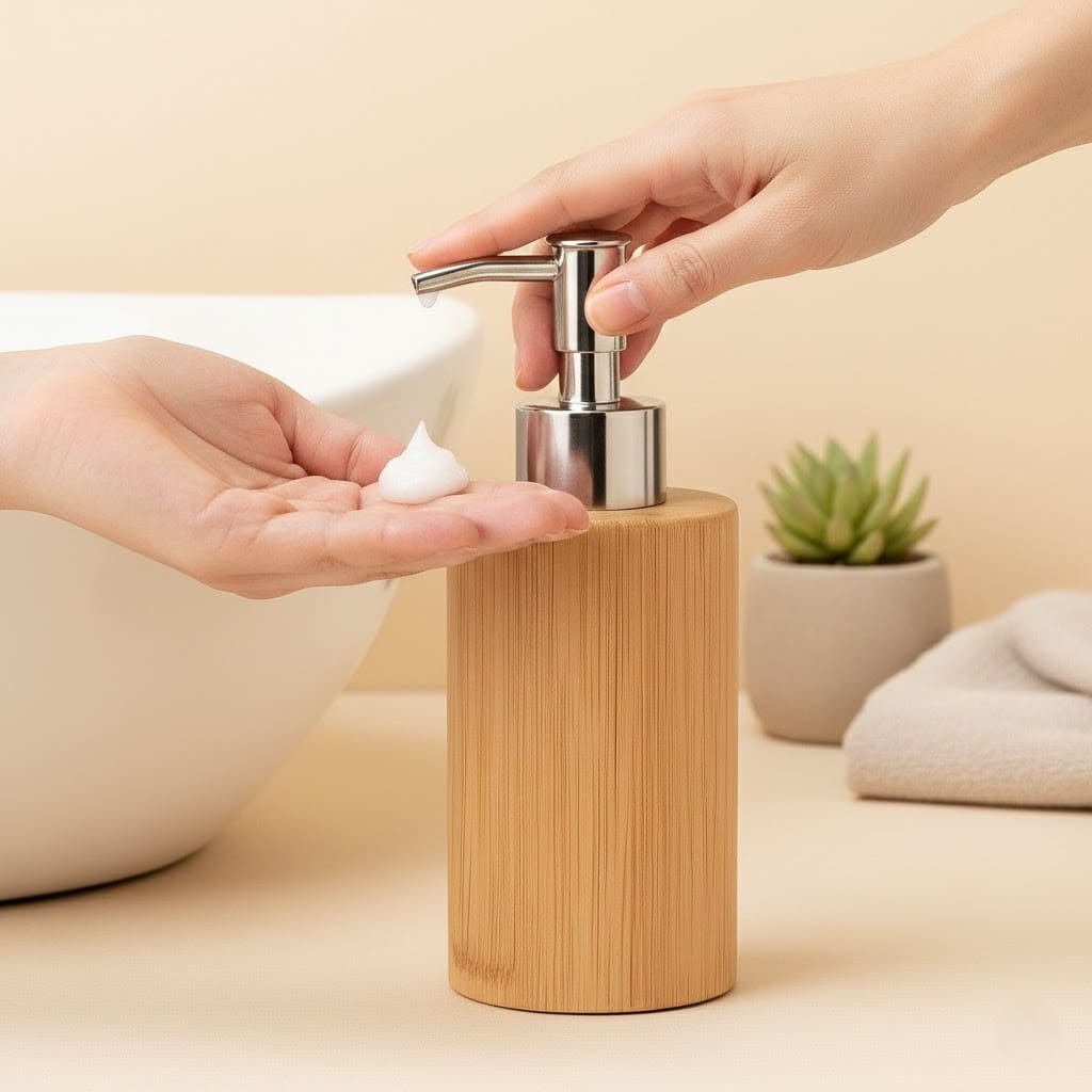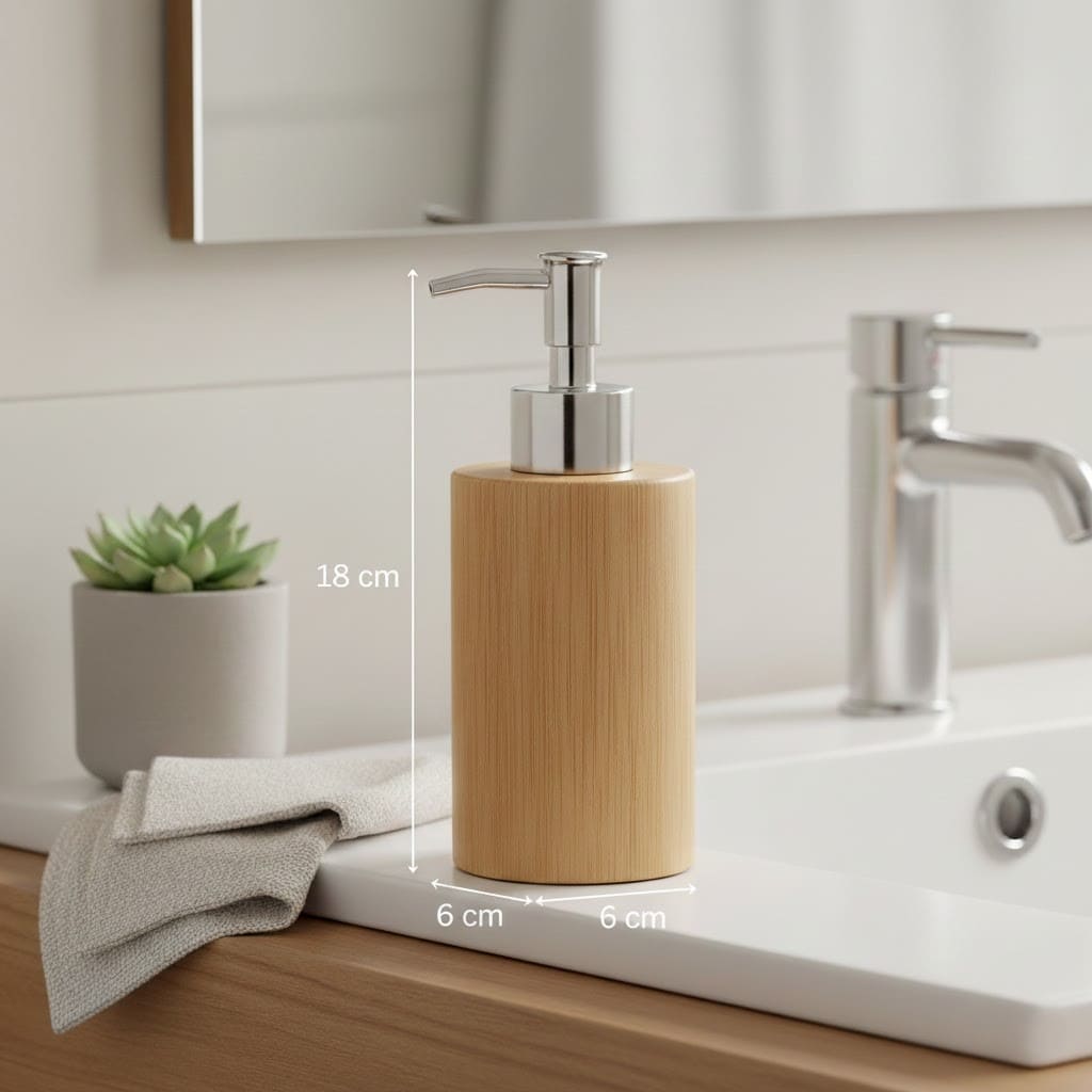 - Material: Bambus / Recyceltem Kunststoff (Innenleben + Pumpkopf)