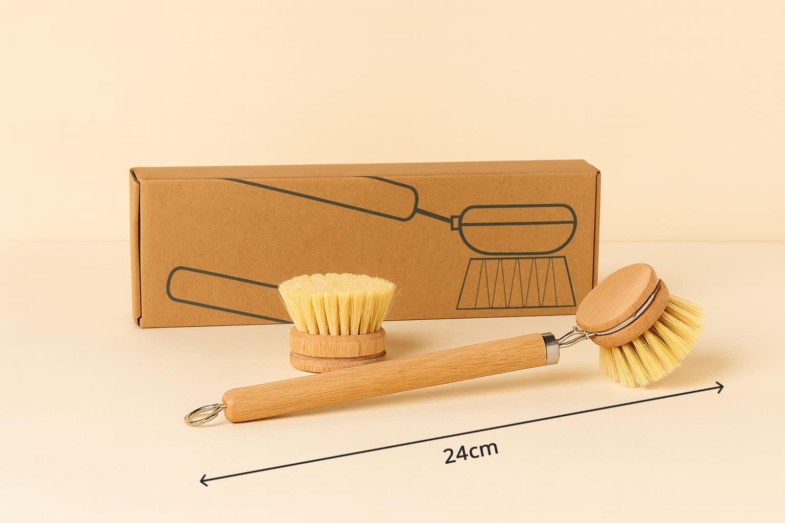 - Spülbürste mit Holzgriff und 2 Ersatz-Bürstenköpfen – ideal für Teller, Töpfe & Pfannen.